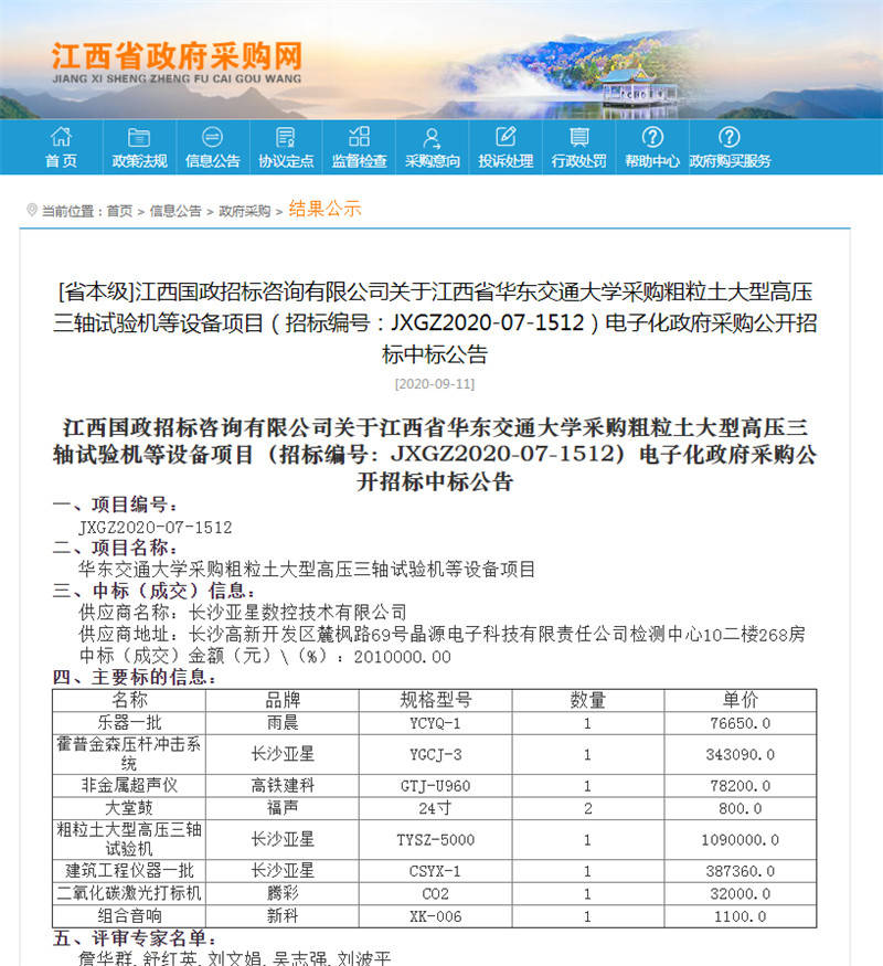 華東交通大學粗粒土大型高壓三軸試驗機等設備采購項目中標